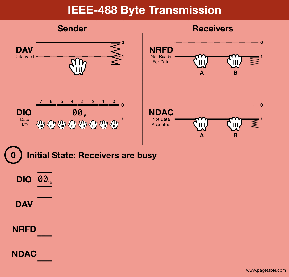 In the initial state, the sender has the 8 data bits set to 0 and DAV to 0, meaning that there is no data available. All receivers have NDAC pulled, meaning that no data was accepted (yet). They may also have NRFD (not ready for data) pulled while they are busy doing other things.