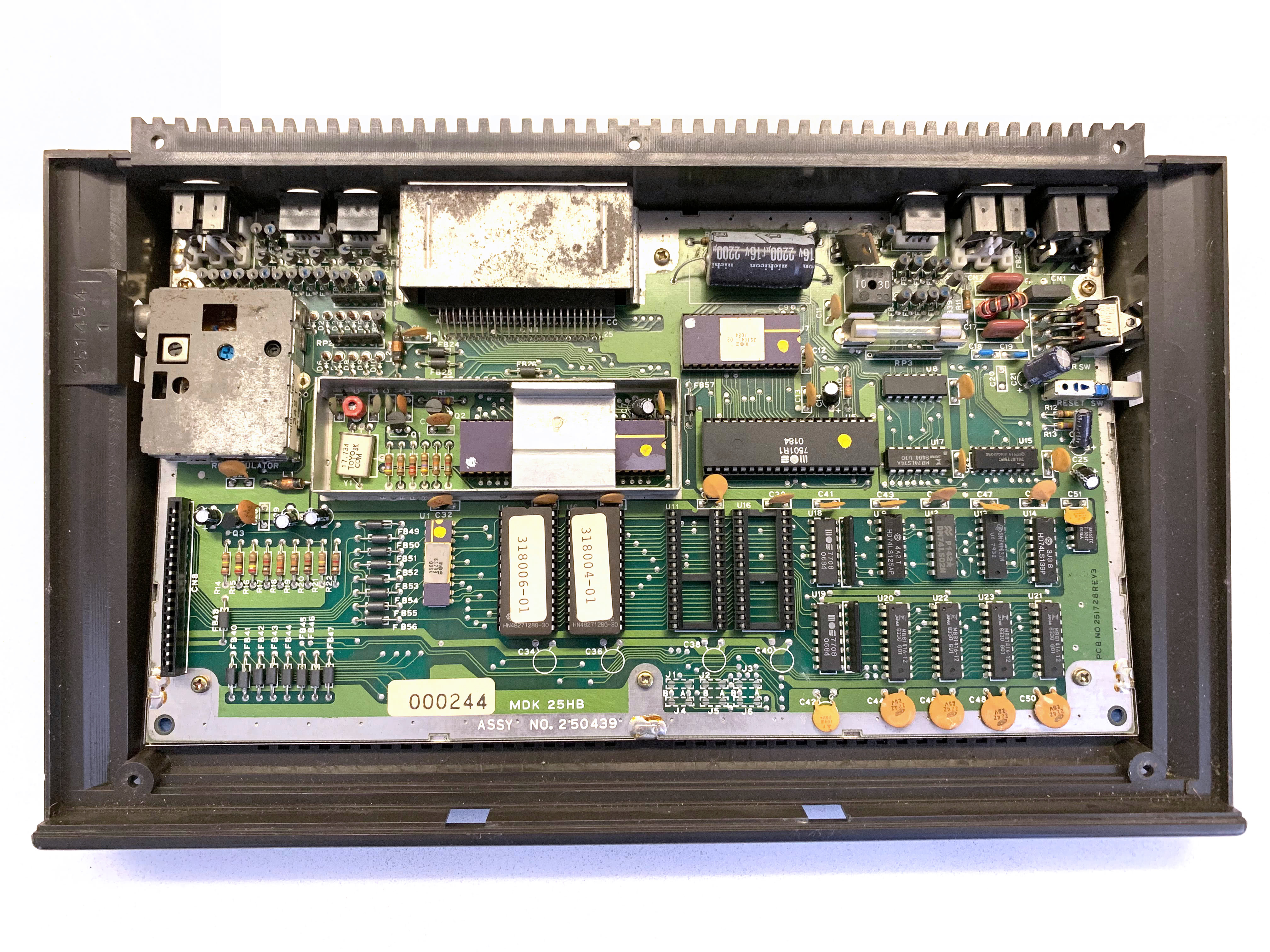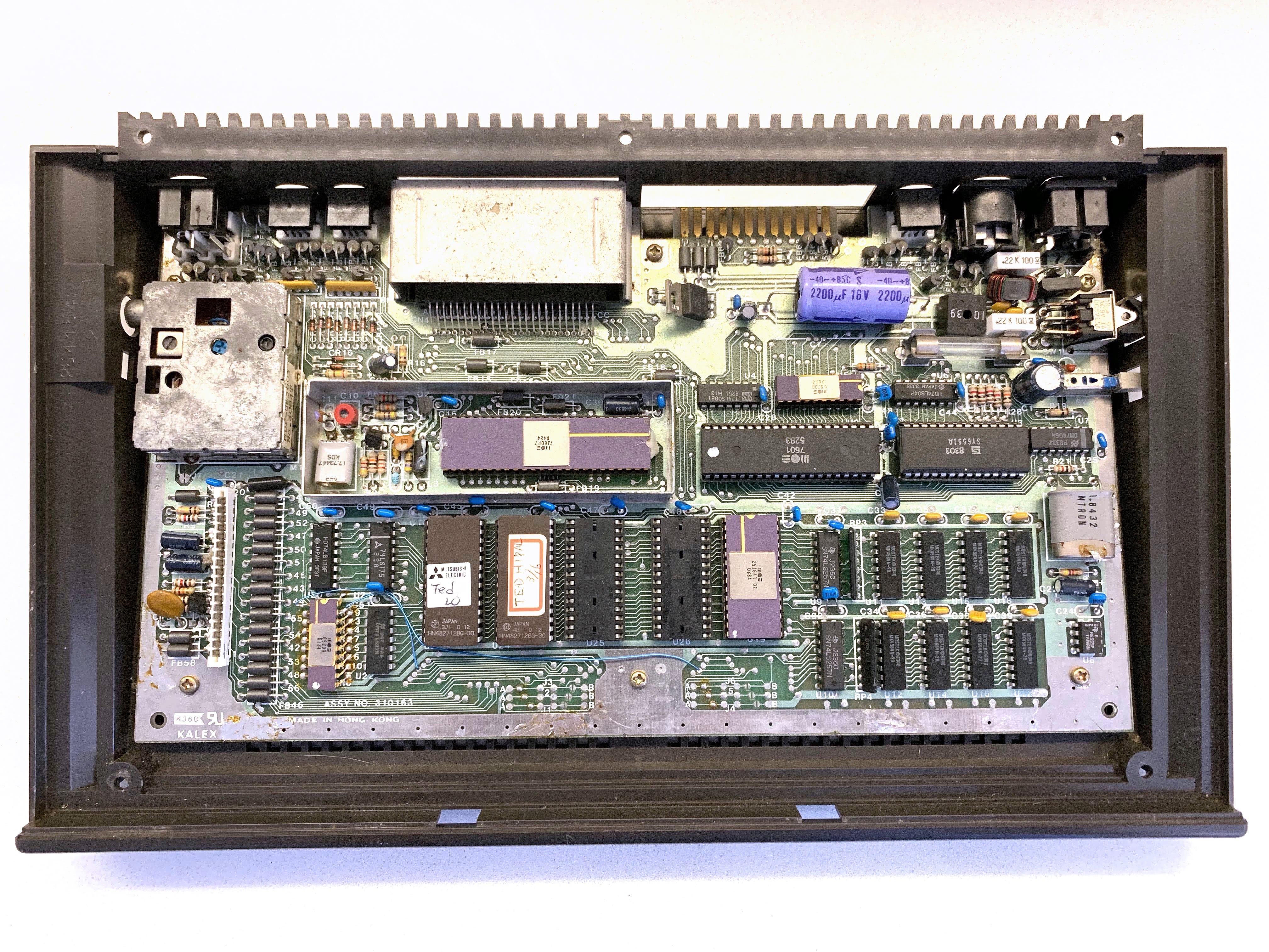 The C-232 board (ASSY NO 250439, PCB NO 251728REV3) is missing the ACIA for the RS232 port (like the C16/C116), but has two sockets for the optional function ROM chips (16 KB each). On the Plus/4, the function ROM contained the “3-plus-1” productivity software. Note the heatsink on the TED chip, which Commodore should have installed on all TED-series machines.