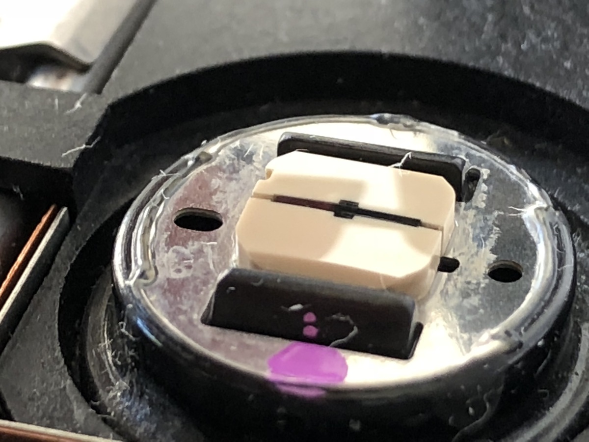 The read head is on the bottom, and there is a spring-loaded counter-weight on the top, which can be easily lifted, so that the cloth can be put between it and the disk’s surface: