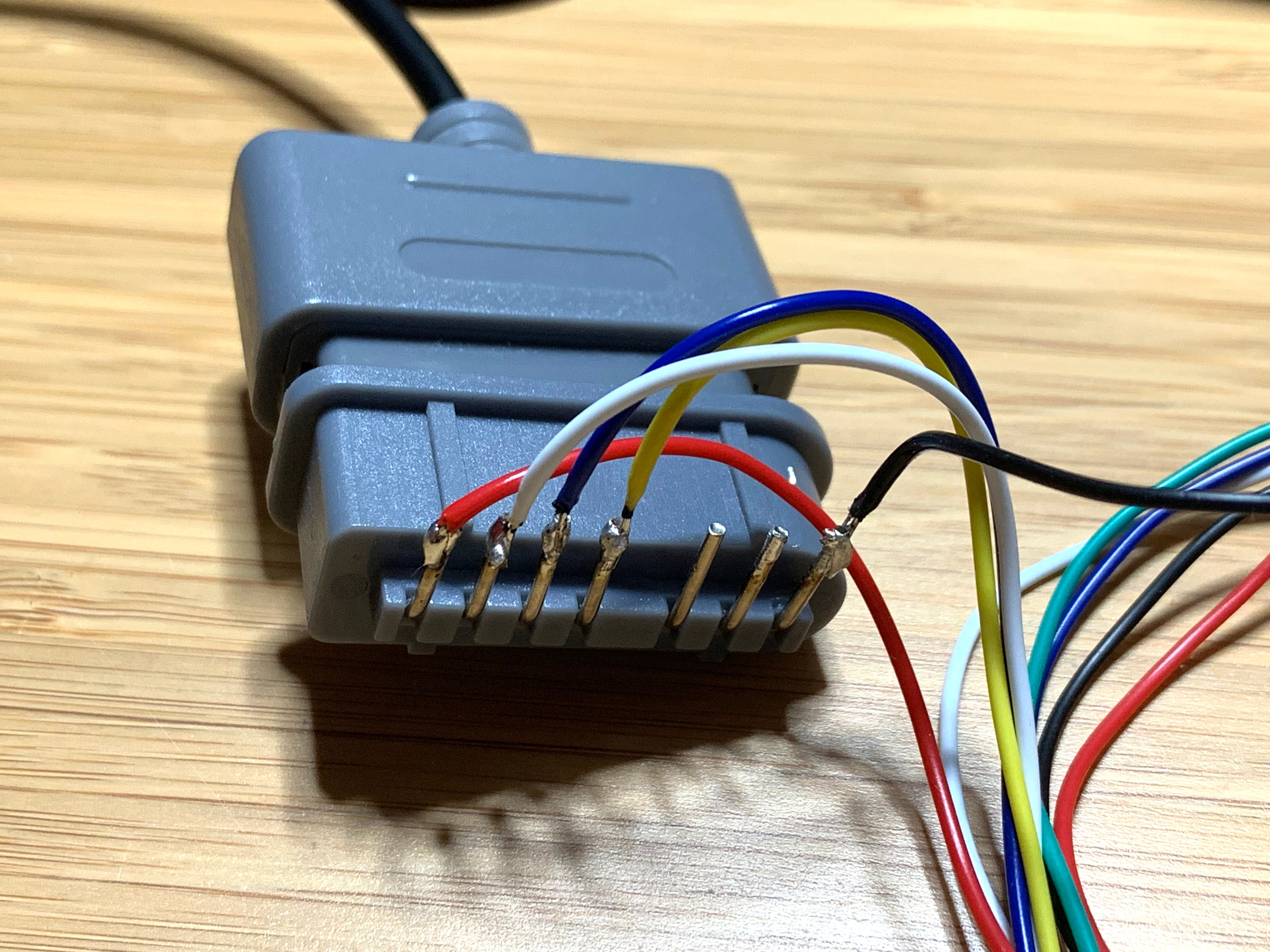 The SNES controller’s pins are just like the NES controller’s, but with a different connector.