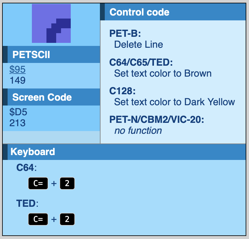 - The checkboxes next to the computer names allow viewing the PETSCII control codes, keyboards and keyboard combinations of multiple computers in all other views.