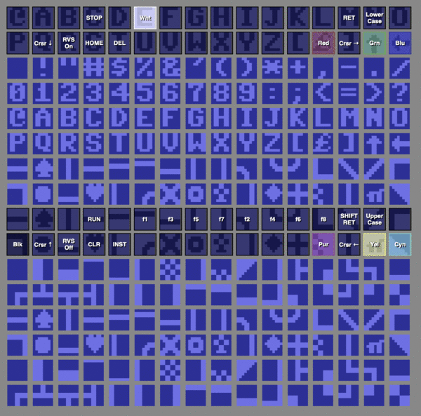 There are three different (related) modes: Character Sets, PETSCII and Keyboard. The controls on the left switch some global settings: