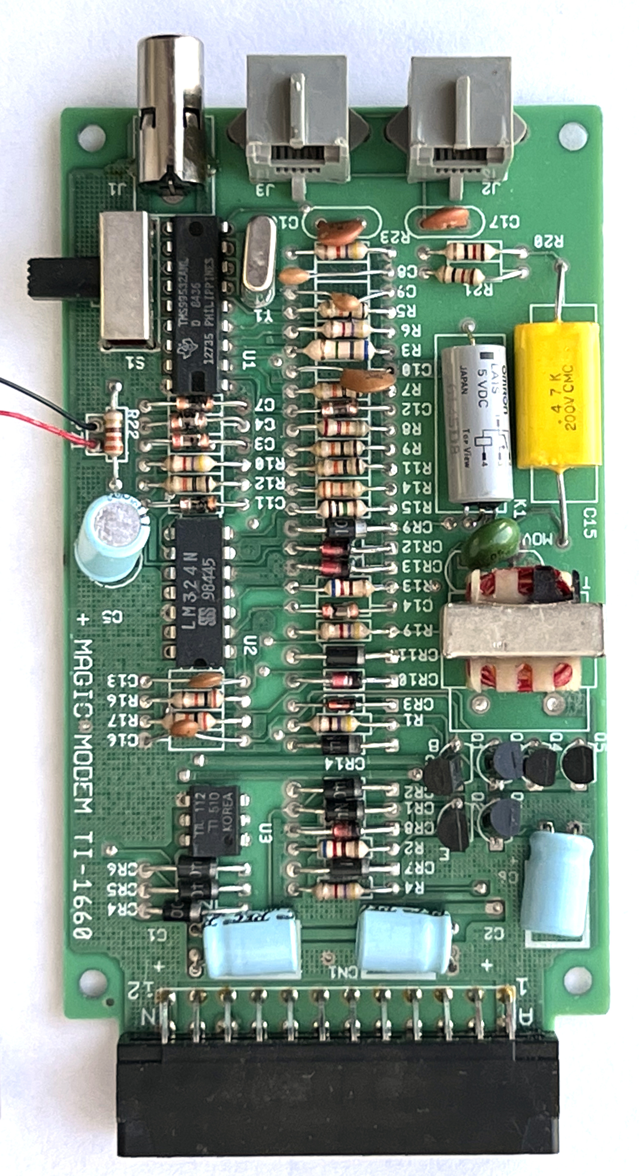The board is marked “MAGIC MODEM TI-1660” and “ARTWORK NO. 310484 REV 4”. The “TI” might stand for “Texas Instruments”, the manufacturer of the TMS99532A modem chip on the top left of the board, which is the central component of the device.