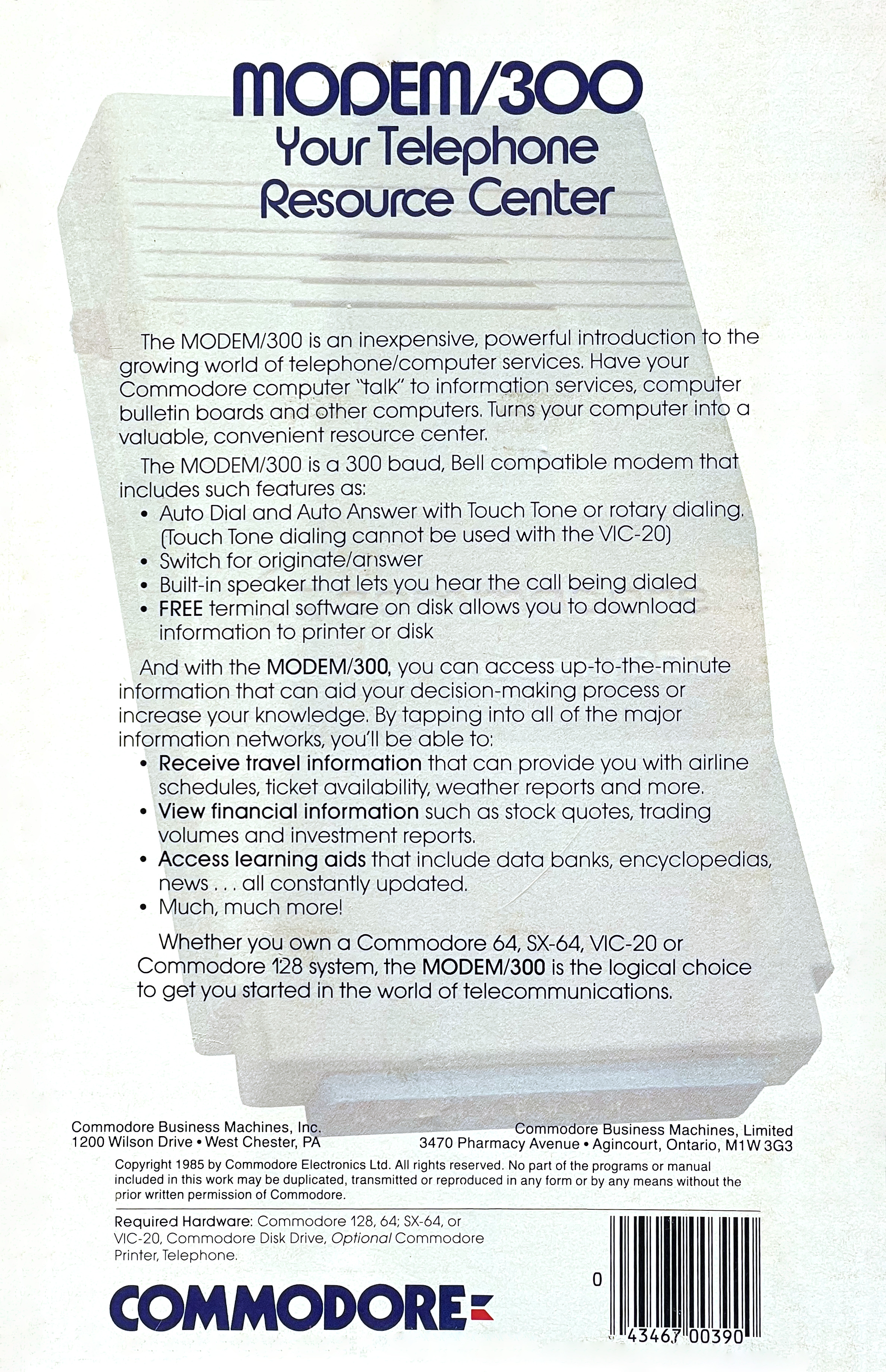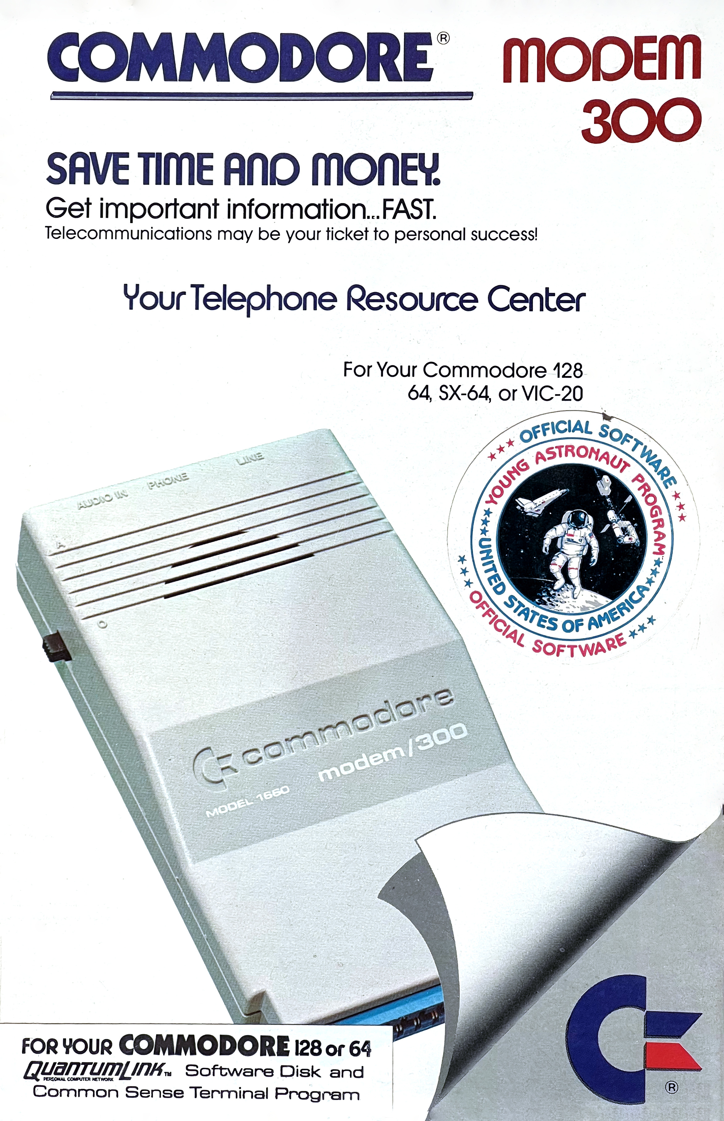 The Commodore 1660, also known as the “Modem/300”, is Commodore’s first full-featured modem: It connects directly to the phone line and supports pulse and tone dialing for 300 baud duplex connections.