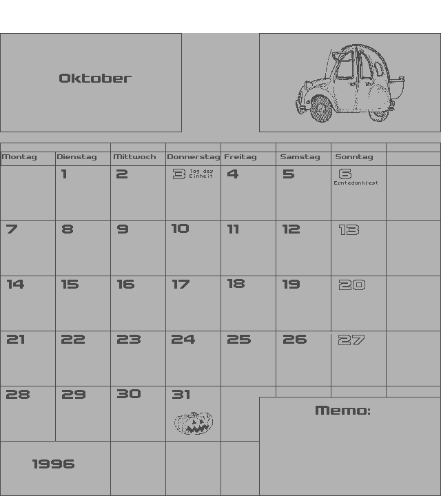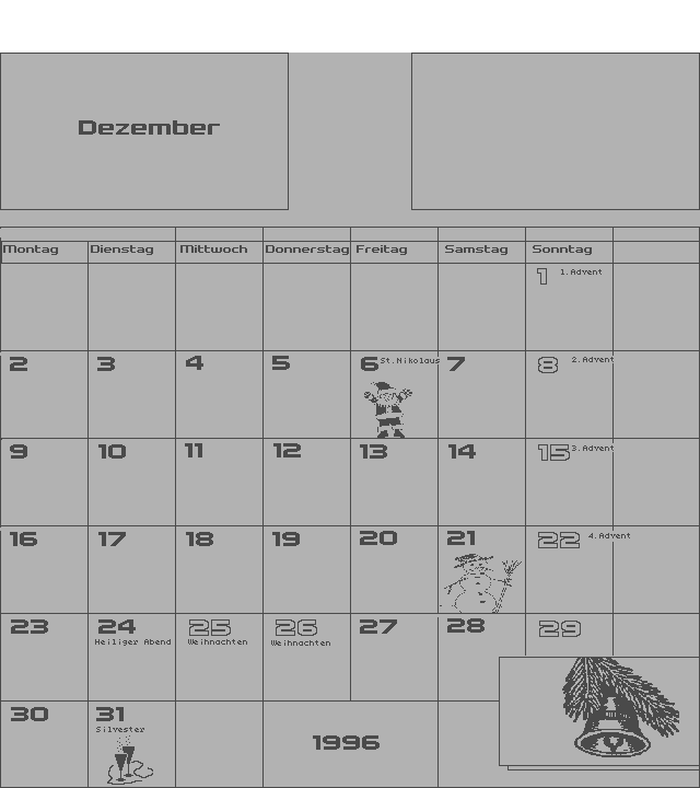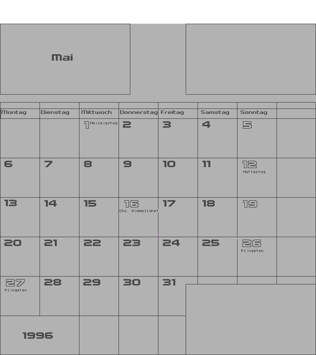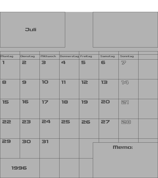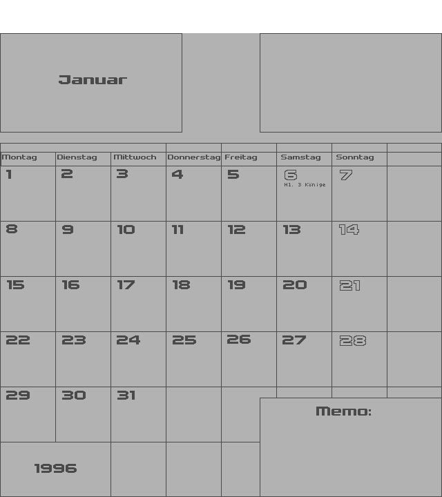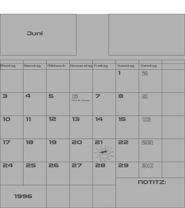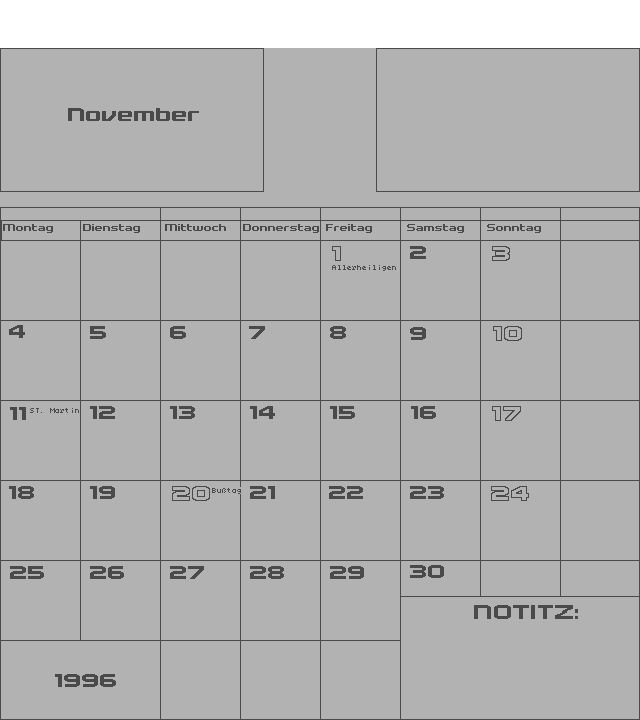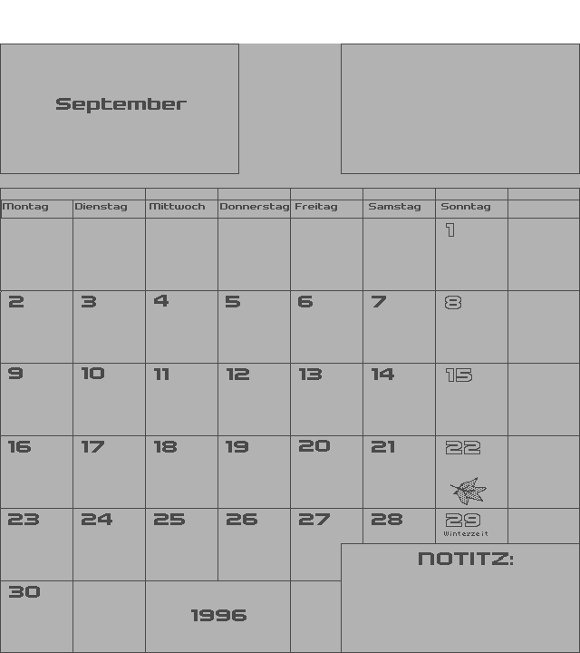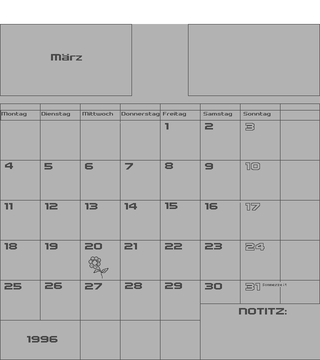| Zeigt einen Monatskalender mit Raum für persönliche Notizen. | ||||||||||
